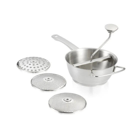 Lieferumfang: Passiermühle, 3 Lochscheiben (fein 2 mm, mittel 3 mm, grob 8 mm)