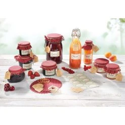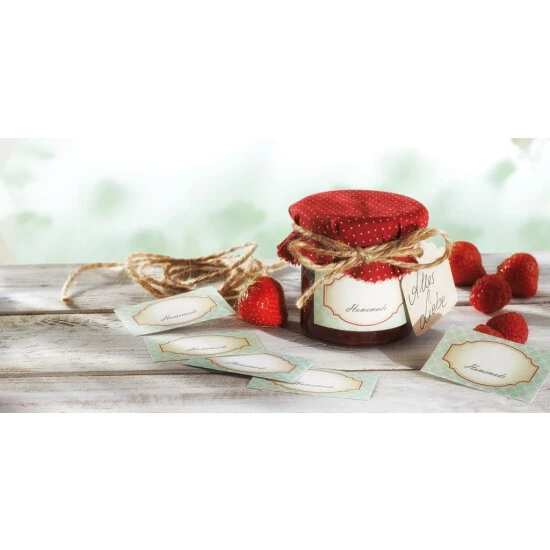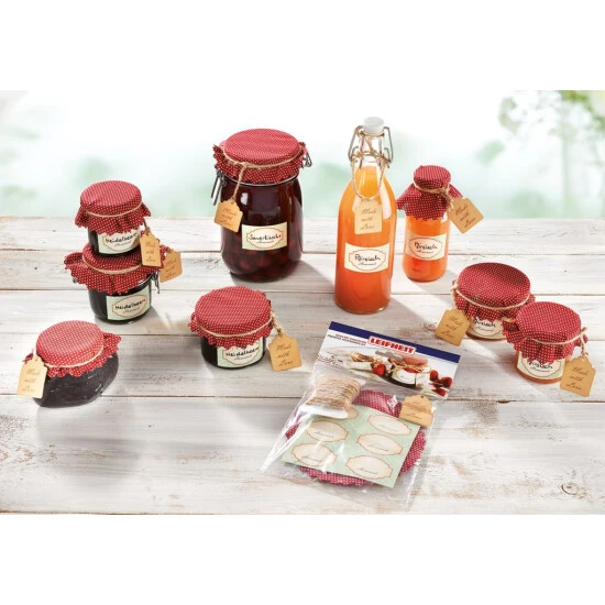 Was gibt es Schöneres, als ein selbstgemachtes Präsent zu überreichen – liebevoll verpackt und hübsch verziert. Das Leifheit Deko-Set Einkochen bietet in nur einem Set alles, um selbstgekochte Marmelade in ein wunderschönes Geschenk zu verwandeln. Ein selbstklebendes Deko-Etikett präsentiert stilvoll den Inhalt – und lässt sich rückstandslos wieder entfernen. Ein Grußkärtchen bietet Platz, um den Beschenkten mit einem persönlichen Gruß oder Glückwunsch zu erfreuen. Der Deckel des Glases verschwindet unter einem hübsch gepunkteten Deckchen, das unsichtbar mit einem Gummibändchen fixiert und anschließend mit einer Kordel aus reiner Naturfaser verziert wird. Liebevoller lässt sich Selbstgemachtes nicht verschenken. Das Deko-Set enthält 10 selbstklebende Etiketten, 10 Grußkärtchen, 10 Baumwolldeckchen mit gewelltem Rand, 10 Fixiergummis und 1 Naturfaserschnur zum Zuschneiden.