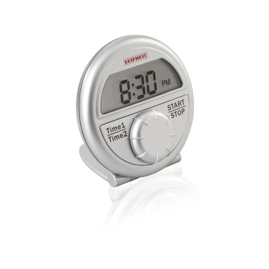 Ein gelungenes Essen ist immer auch eine Frage des richtigen Timings. Für die perfekten Garzeiten sorgt ab jetzt der digitale Kurzzeitmesser von Leifheit. Das Besondere: Der digitale Timer misst zwei Zeiten parallel. Zu bedienen ist er so einfach wie ein analoger Kurzzeitmesser: Einfach per Drehknopf den Countdown einstellen, fertig. Der Fuß des Timers besitzt ein Gelenk, um die Neigung des Displays individuell einstellen zu können. So lässt sich die Lesbarkeit der großen Zahlen nochmals verbessern. Mit Uhrfunktion.