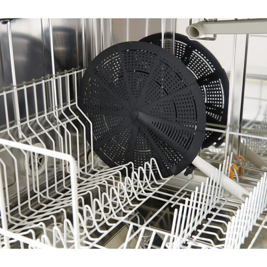 Der Spritzschutz kann zusammengefaltet platzsparend in jeder Besteckschublade verstaut oder an der Öse im Griff aufgehangen werden.