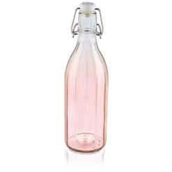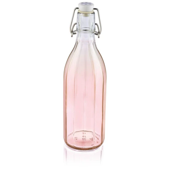 Eine Flasche perfekt für den Vintage-, Retro- und Landhausstil, ausgestattet mit einem hochwertigen Bügelverschluss aus rostfreiem Edelstahl, der die Flasche luftdicht verschließt, sodass der Inhalt lange frisch bleibt. Verwenden lässt sich die Facetten-Flasche in der praktischen 0,5-Liter-Größe für alles, was dekorativ aufbewahrt und stilvoll verschenkt werden soll. Seien es frisch gepresste Säfte, aromatisiertes Öl mit Kräuterzweigen, Chili oder Knoblauch oder selbstgemachter Likör. Ebenso eignen sich die Flaschen für Sirup, der kochend heiß eingefüllt werden kann, oder einfach für frisch aufgesprudeltes Leitungswasser, dass man entspannt genießen kann. Denn die Leifheit Glasflasche ist die schadstofffreie Alternative zu Trinkflaschen aus Kunststoff. Mit ihrem zarten Farbverlauf eignet sie sich zudem wunderschön für kreative DIY Projekte oder als Blumenvase, die der Tischdeko mit ihrem dezenten Roséton den letzten Schliff verleiht. Die Facetten-Flasche besteht aus hitzebeständigem Glas und kann mit bis zu 100 °C heißer Flüssigkeit befüllt werden. Die Flasche inklusive Edelstahlverschluss ist rostfrei und spülmaschinengeeignet. BPA-frei.