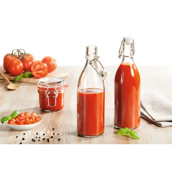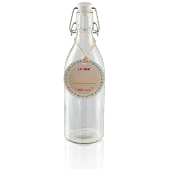Die praktische Allround-Bügelflasche, die sich immer wieder verwenden lässt. Der hochwertige Drahtbügelverschluss aus rostfreiem Edelstahl und das hitzebeständige Glas machen die Flasche so robust wie vielseitig einsetzbar. Sicher und dicht verschließt sie selbst hergestellte Obst- und Gemüsesäfte, selbstgemachte Liköre und Sirups, mit Kräutern verfeinerte Öle und Essige oder Salatdressings. Einfach alles, was sauber aufbewahrt und sicher transportiert werden soll. Selbst um Einkochen eignet sich das hitzebeständige Glas der runden Flaschen. Der Drahtbügelverschluss lässt sich ganz ohne Kraftaufwand öffnen und schließen. Nach Gebrauch lassen sich die Flaschen einfach und schnell in der Spülmaschine reinigen.
