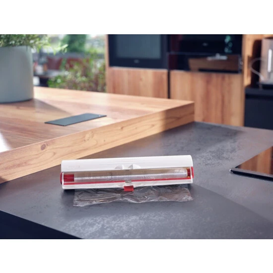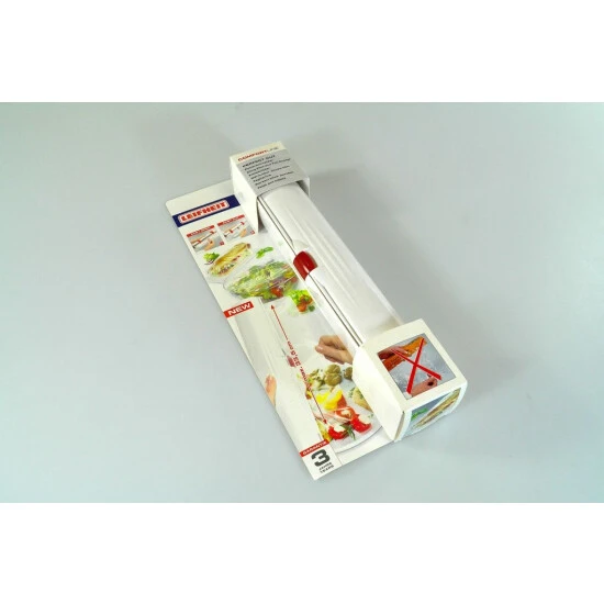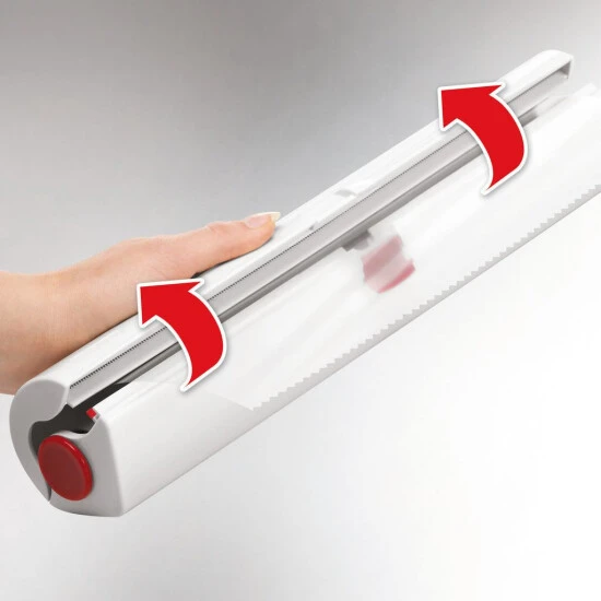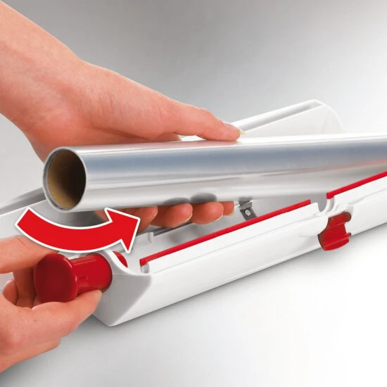 – Der einzige Folienschneider, der für die neue Länge der Frischhaltefolien (33 cm) geeignet ist – Nie mehr verknitterte Frischhaltefolie – Folie auf die gewünschte Länge herausziehen, über Teller oder Schüssel halten und straffen – Deckel zudrücken und so die gespannte Folie sauber abschneiden – Auch geeignet für Alufolie – Maximale Rollenbreite: 33 cm –