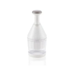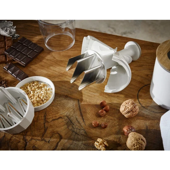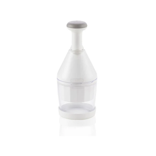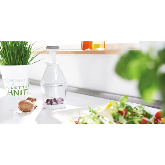 – Der gut in der Hand liegende Knauf setzt ein extra scharfes Edelstahlmesser in Gang, das mühelos Zwiebeln, Knoblauch, Gemüse, Nüsse und Schokolade zerkleinert