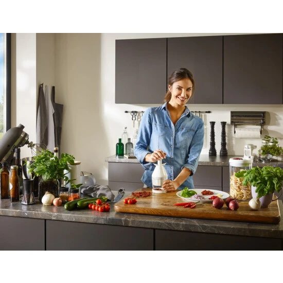 – Weiteres Plus: Durch das einsehbare Gehäuseunterteil lässt sich jederzeit das gewünschte Ergebnis kontrollieren und dank des praktischen Auffangbehälters bleibt die Arbeitsplatte sauber und die zerkleinerten Zutaten lassen sich leicht weiterverarbeiten