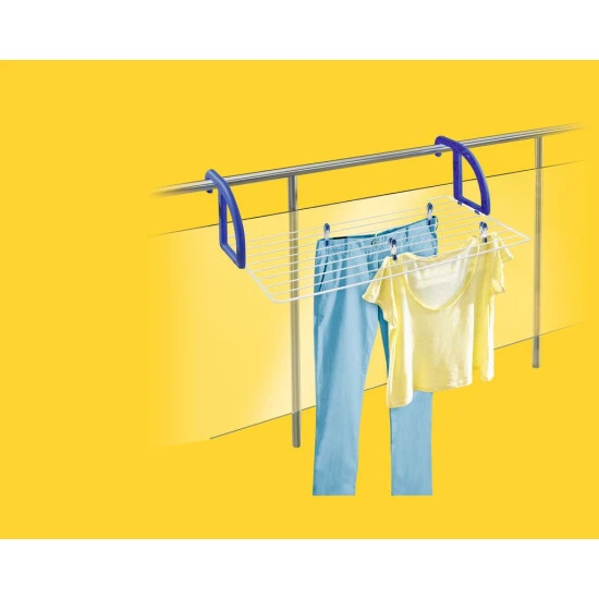 Der ideale Helfer, um selbst auf dem kleinsten Balkon die Wäsche an der frischen Luft zu trocknen. Der Leifheit Hängetrockner Classic 70 ist komplett ohne Bohren, Schmutz und Staub mit einem Handgriff im Einsatz. Einfach über die Balkonbrüstung hängen, fertig. Der Hängetrockner bietet der Wäsche einen Platz von sieben Meter zum trocknen. Damit er stabil hängt, lassen sich die Halterungen auf die Breite der Balkonbrüstung befestigen. Perfekt angepasst aufs Outdoor-Trocknen ist die Qualität der Materialien: Die Trockenstäbe sind absolut UV-beständig und mit einer Antislip-Ummantelung geschützt. So bleibt die Wäsche auch bei leichtem Wind sicher hängen. Nach dem Trocknen einfach Trockenstäbe und Aufhängungen einklappen und schon verschwindet der Hängetrockner Classic 70 in der kleinsten Ecke.