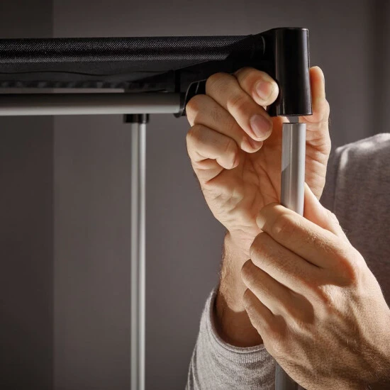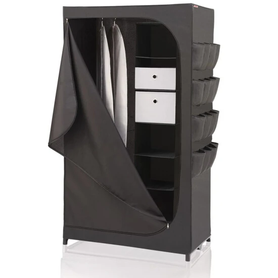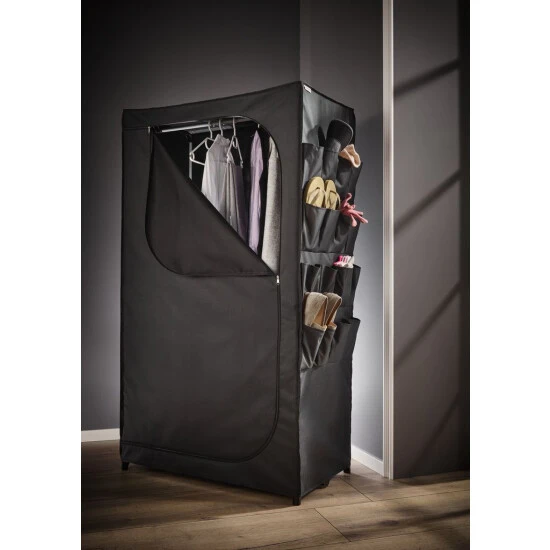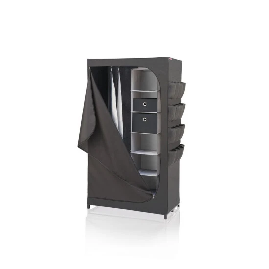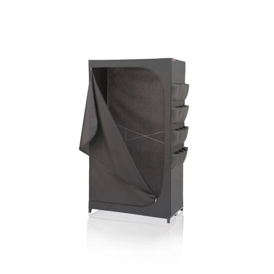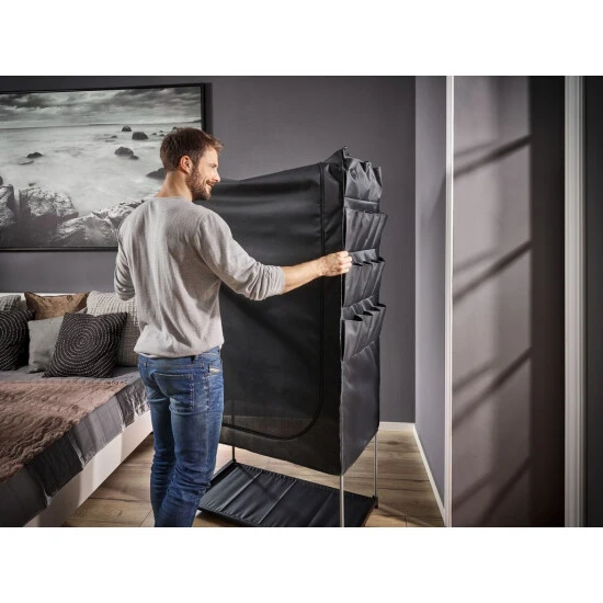Der Leifheit Flex Kleiderschrank ist ein wahres Raumwunder und überzeugt mit hoher Standfestigkeit und Langlebigkeit. Ob Ski-, Wander- oder Strandbekleidung, ob Jacken, Kleider, Hosen, Accessoires oder Schuhe: Der Flex Schrank bietet mit seinem geräumigen Innenleben, der soliden Kleiderstange und 16 superpraktischen, seitlich angebrachten Außentaschen enorm viel Platz. Dabei steht er selbst voll beladen absolut stabil und fest. Denn ausgestattet ist die mobile Schranklösung mit einem robusten Gestell mit verstärkten Steckverbindungen, einem rückseitigen Stabilitätskreuz und einem Spannboden. Auch der mehrlagige, engmaschig gewebte Stoff erhöht die Standfestigkeit. Zugleich schützt er den Inhalt gut vor Staub und Schmutz, ist atmungsaktiv und abwaschbar. Schnell öffnen und schließen lässt sich der Kleiderschrank mit einem leichtgängigen, langlebigen Reißverschluss. Ob Hängeregal, Boxen in Groß und Klein, Vakuumbeutel oder Kleiderhüllen – mit dem Leifheit Combi-System lässt sich der Schrank jederzeit individuell erweitern. Und wird er für eine Saison nicht , ist er schnell zusammengefaltet und platzsparend verstaut.