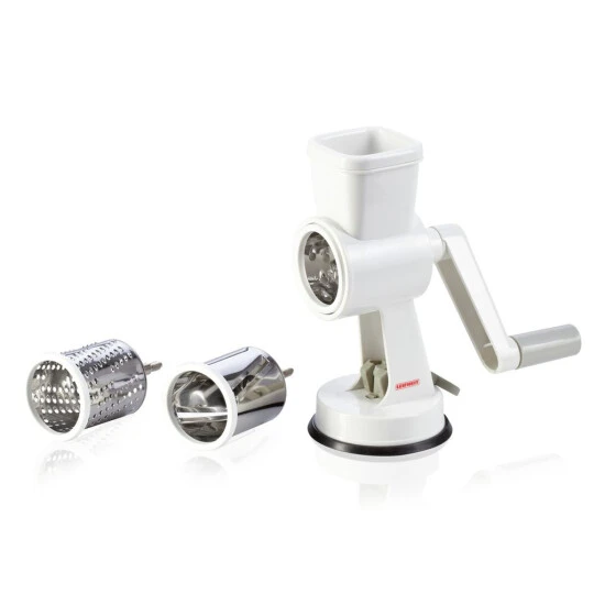 - Handmühle mit 3 auswechselbaren Reibtrommeln (fein, grob, Klinge)