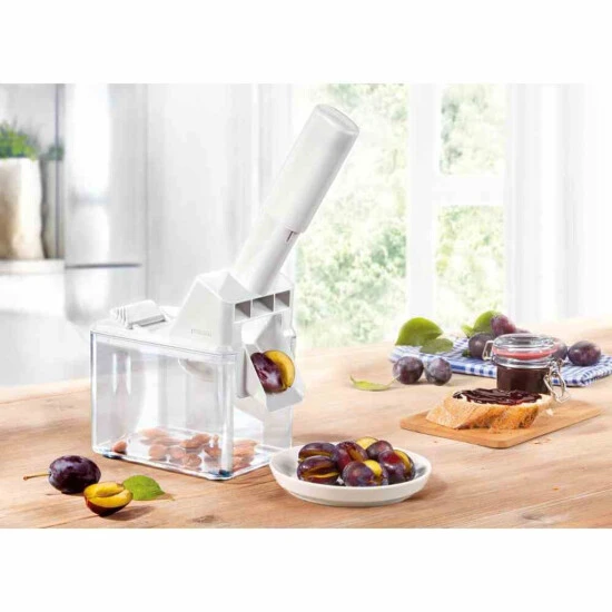 - entsteint und schneidet große und kleine Pflaumen und Zwetschgen sowie Mirabellen kuchengerecht