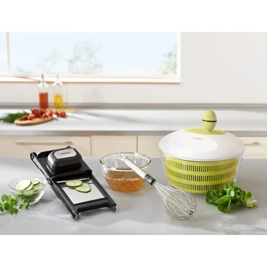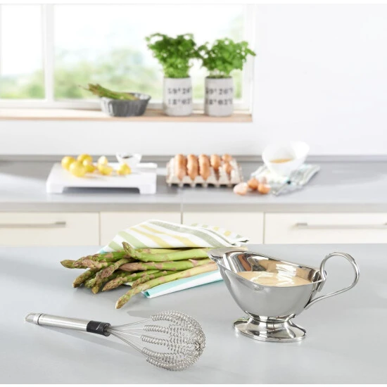 Doppelt so schnell Soßen aufschlagen, Cremes schaumig rühren oder Milch aufschäumen. Der neue Leifheit Speed Quirl ist der erste Schneebesen, der richtig Tempo macht. Jeder der acht Drähte des neuartigen Schneebesens ist aufwändig gezwirbelt. Das erhöht die Länge der Drähte um ein Vielfaches und damit auch den Rührwiderstand. Das Ergebnis: 50 Prozent Zeitersparnis und deutlich weniger Kraftaufwand. Da können Küchenmaschine und Rührgerät getrost im Schrank bleiben. Der Speed Quirl ist schnell im Einsatz und ebenso schnell wieder sauber. Einfach in die Spülmaschine legen, fertig. Mit hochwertigem Edelstahlgriff für eine angenehme Handhabung und Aufhängöse. Der Speed Quirl wurde entwickelt in Zusammenarbeit mit Starkoch Christian Henze.