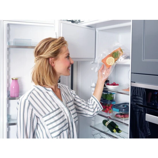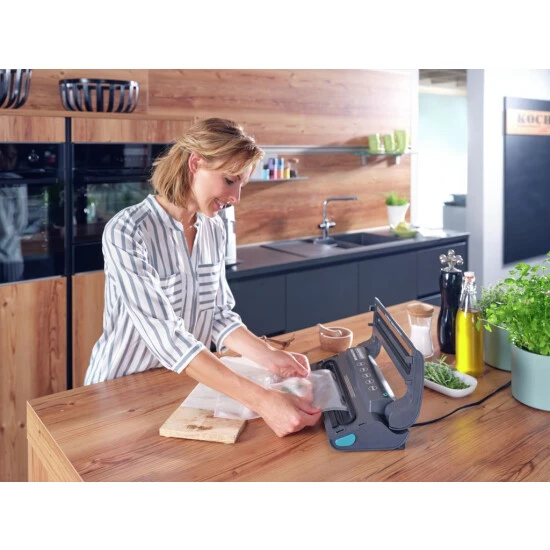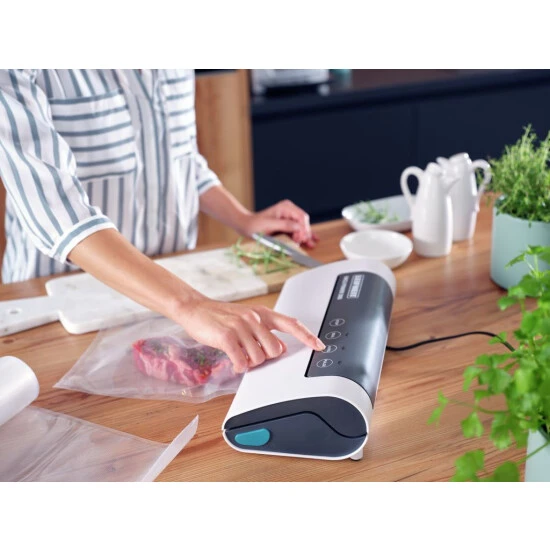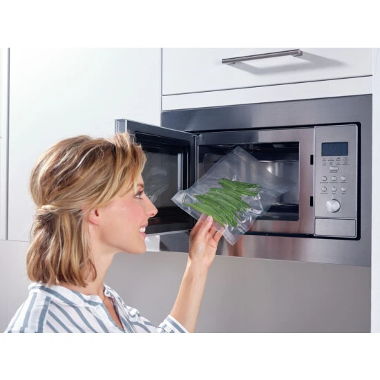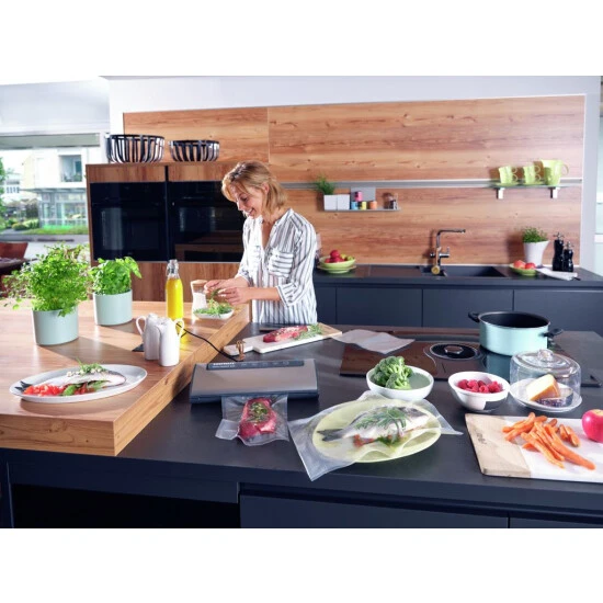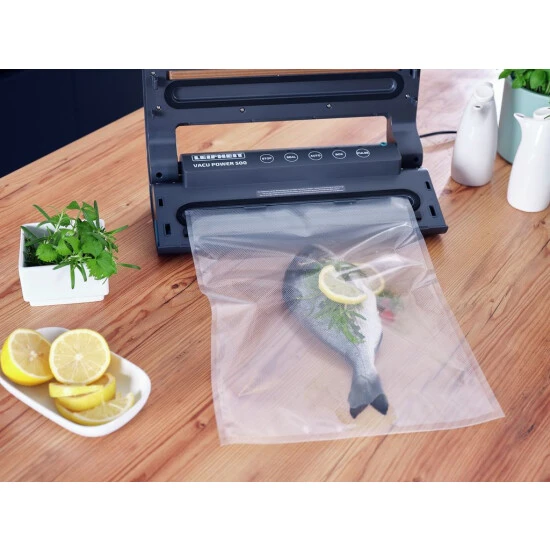 Wer seine Lebensmittel aroma-, wasser- und luftdicht verschließen möchte, für den sind die Vakuum-Rollen (20 x 600 cm) von Leifheit die richtige Wahl. Dank ihrer speziellen Struktur eignen sich diese ideal zum Vakuumieren von Fleisch, Fisch, Gemüse und Co. Lebensmittel können so bis zu 5x länger frisch gehalten werden. Mit der separaten Versiegelungsfunktion aller Leifheit Vakuumier-Geräte lässt sich innerhalb weniger Sekunden aus einer Rolle ein Vakuum-Beutel erstellen. Denn die Rollen sind flexibel zuschneidbar und so kann die Länge individuell je nach Bedarf bestimmt werden. Die Rollen sind natürlich auch zum Sous-Vide garen perfekt geeignet und sorgen dafür, dass Nährstoffe, Vitamine sowie Aromen bei der Zubereitung erhalten bleiben. Die Vakuum-Rollen sind robust sowie reißfest und schützen den Inhalt optimal. Selbstverständlich sind die Rollen auch zum Einfrieren geeignet und dürfen ebenfalls in die Mikrowelle. Passend sind die Vakuum-Rollen nicht nur für alle Vakuumier-Geräte von Leifheit, sondern auch für Geräte anderer Hersteller. Der Kunststoff ist selbstverständlich frei von BPA und somit völlig bedenkenlos. Das erleichtert die Organisation und Kontrolle.