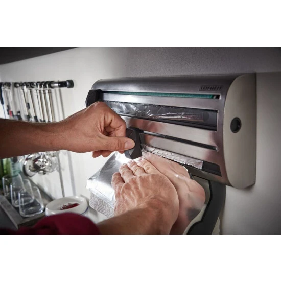 Dort, wo die Einwegverpackung stets den Anfang der Klarsichtfolie verschwinden lässt, hält der Leifheit Wandrollenhalter aus Edelstahl nach jedem Schnitt wieder den Anfang der Folie griffbereit. Per Klick geöffnet, lässt sich der Parat Royal ProLine Wandrollenhalter einfach von vorn bestücken und wieder verschließen. Neben Rollenschacht für Aluminium- und Klarsichtfolie bietet eine dritte Halterung im Leifheit Wandrollenhalter Platz für die Küchenpapierrolle und hält