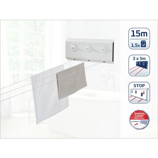 - Insgesamt 15 Meter Leinenlänge: 3 mal 5 Meter für 1 bis 2 Waschmaschinenfüllungen