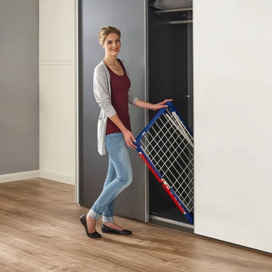 Auf den 1,05 m hohen Flügeln haben lange Wäschestücke Platz. Der Pegasus 150 ist auch mit zwei Kleinteilehaltern ausgestattet, die an der Seite des Wäscheständers befestigt werden können. Dort können Socken, Taschentücher und Unterwäsche ganz ohne Wäscheklammern aufgehängt werden, einfach einklemmen! Nach Gebrauch lässt sich der Wäscheständer flach lagern. Er ist völlig rostfrei.