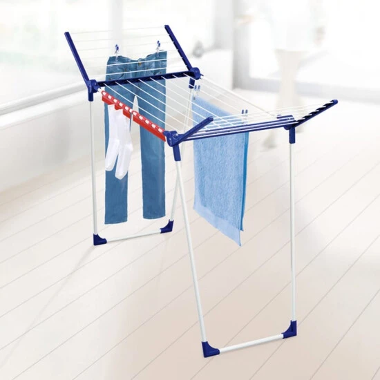 Mit seinen klappbaren Seitenflügeln bietet er reichlich Platz auch für große Wäschestücke, während sich kleine Wäschestücke platzsparend am Kleinteilehalter aufhängen lassen. Er ist nur 55 cm schmal und passt daher auch ausgeklappt problemlos durch jede Eingangs- oder Balkontür, was sich bei einem plötzlichen Regenschauer als besonders praktisch erweist. Zudem sorgen die zwei rutschfesten Standbeine selbst bei Wind für einen stabilen Stand, sei es auf dem Balkon, im Garten oder auf glatten Böden. Die zwei Seitenflügel erweitern die Trockenlänge bis auf insgesamt 15 Metern, sodass sich 1-2 Waschmaschinenladungen gleichzeitig darauf trocknen lassen.